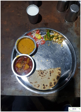 The most common foods of Junagadh are Rotla(thick rotis) made from the Bajraflour (Pearl millet flour), Bhakri (made from Atta), Thepla, RinganBataka nu sabzi,Ringanbhurta(Brinjalbhurta)SevTomatar nu sabzi,LasanBataka nu sabzi, Lasankichutney(Garlic chutney)and Chhas(Butter milk).The vegetable preparation are spicy and hot. The people like to go out for meals in the local food joints. The foods from other states have the influenced the traditional food habits of the Junagadh local people. I decided to visit a local traditional food joint to taste Gujarati food. That food joint was in the centre of the Junagadh town. It was nice to know that a local family was running the Gujarati food joint. It was an ordinary food joint, but it had the warmth of hospitality. I ordered for theRotla, Ringanbataka nu sak, Moong dal and the chhas(butter-milk). I requested their permission to shoot video of the Rotla preparation specially as the lady cook of the food joint prepared in hand. The preparation reminded us about the cooking methods of (1960-70) in wood fired chulla. The video of the Live cooking of Rotla is too enclosed whose link is given here. Rotla preparation, authentic way in a Junagadh food joint